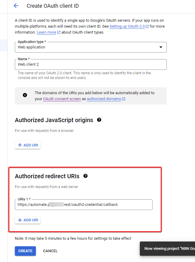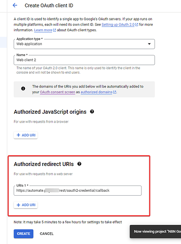 Now Go Back to Google Console Services, Enter the URI and clickSelect CREATE.