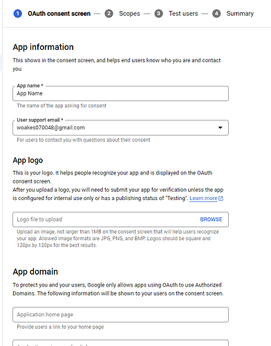 Enter the essential information: App name, User support email, and the Email addresses field in Developer contact information.