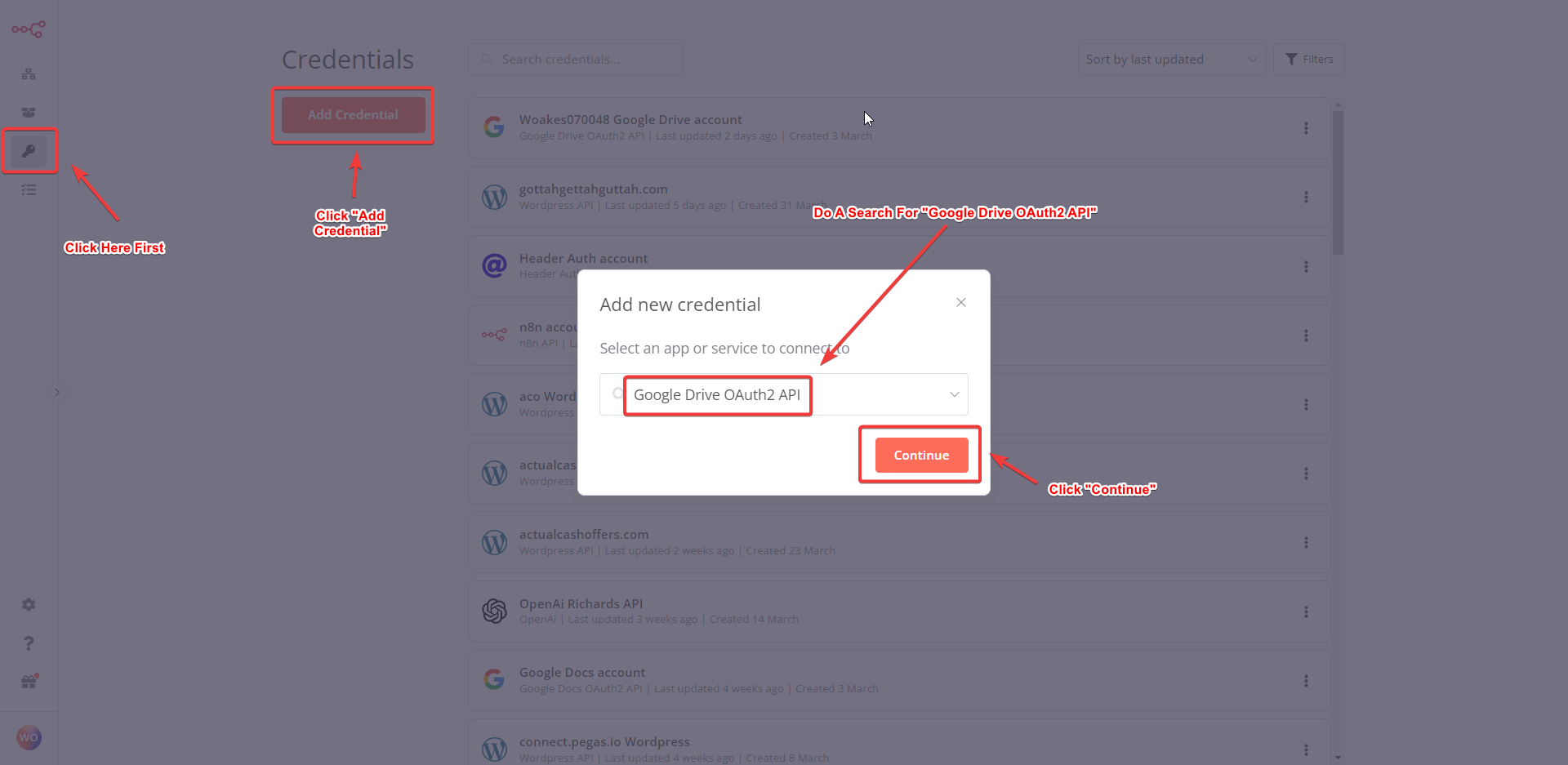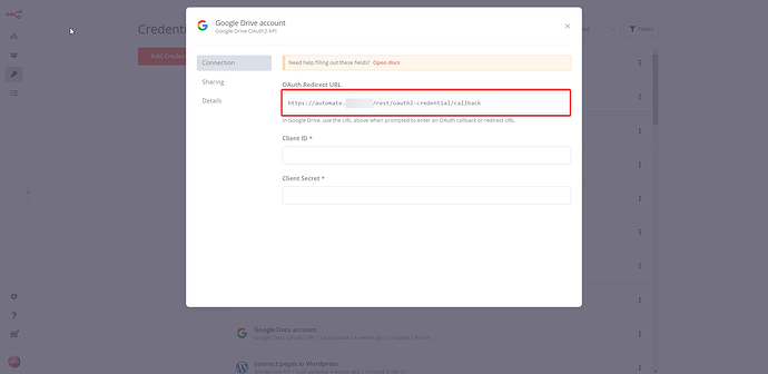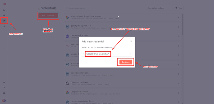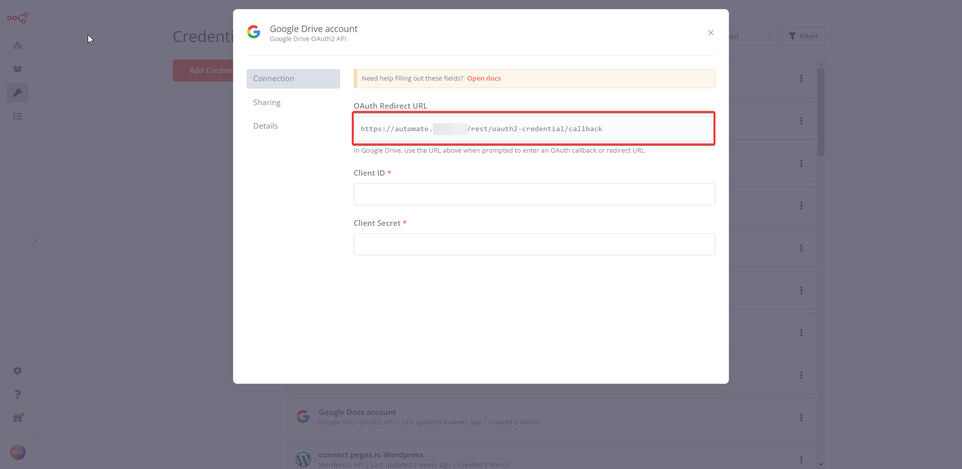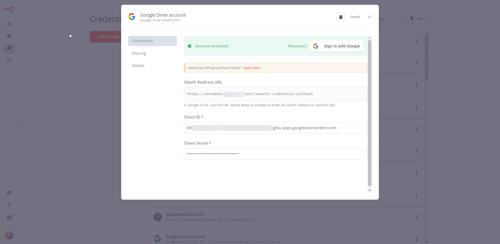 In n8n: a. Enter your new Client ID and Client Secret from Google Cloud Console in the credentials modal.
