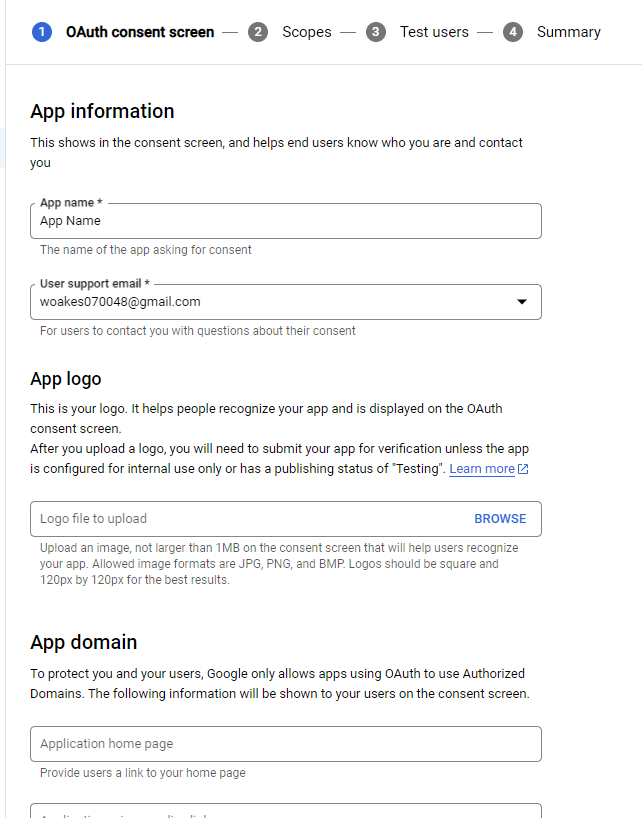 Select SAVE AND CONTINUE to go to the Scopes page. g. You don’t need to set any scopes. Select SAVE AND CONTINUE again to go to the Summary page.