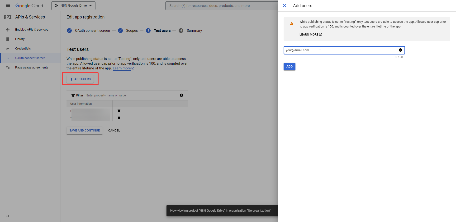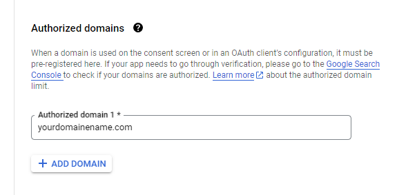 Add an authorized domain: select + ADD DOMAIN. Enter the domain of your n8n instance. An example would be automate.your_domaine_name.com.