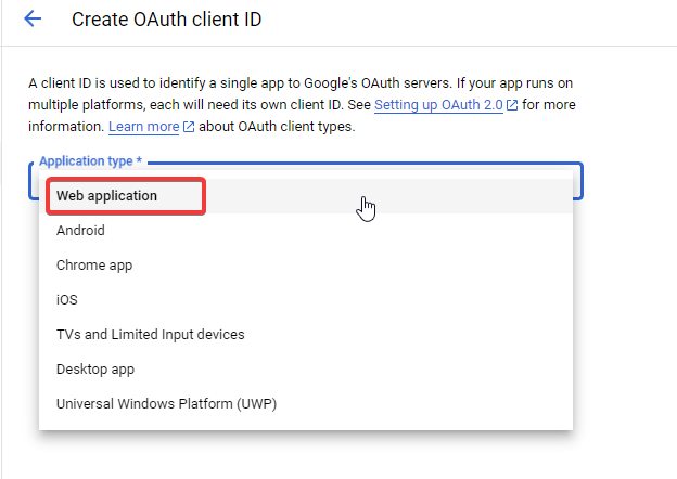 In the Application type dropdown, select Web application. Google automatically generates a name.