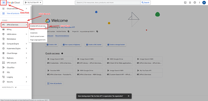 Navigate to the APIs & Services Dashboard by clicking on the hamburger menu in the top-left corner and selecting “APIs & Services” > “Dashboard”. -