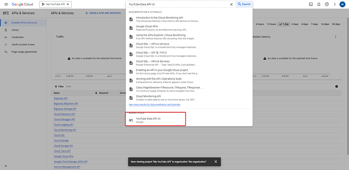 Search for and select “YouTube Data API v3” from the list of available APIs. -