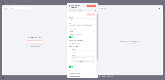Configure the HTTP Request node by entering the Pexels API endpoint URL in the “URL” field: https://api.pexels.com/v1/search.